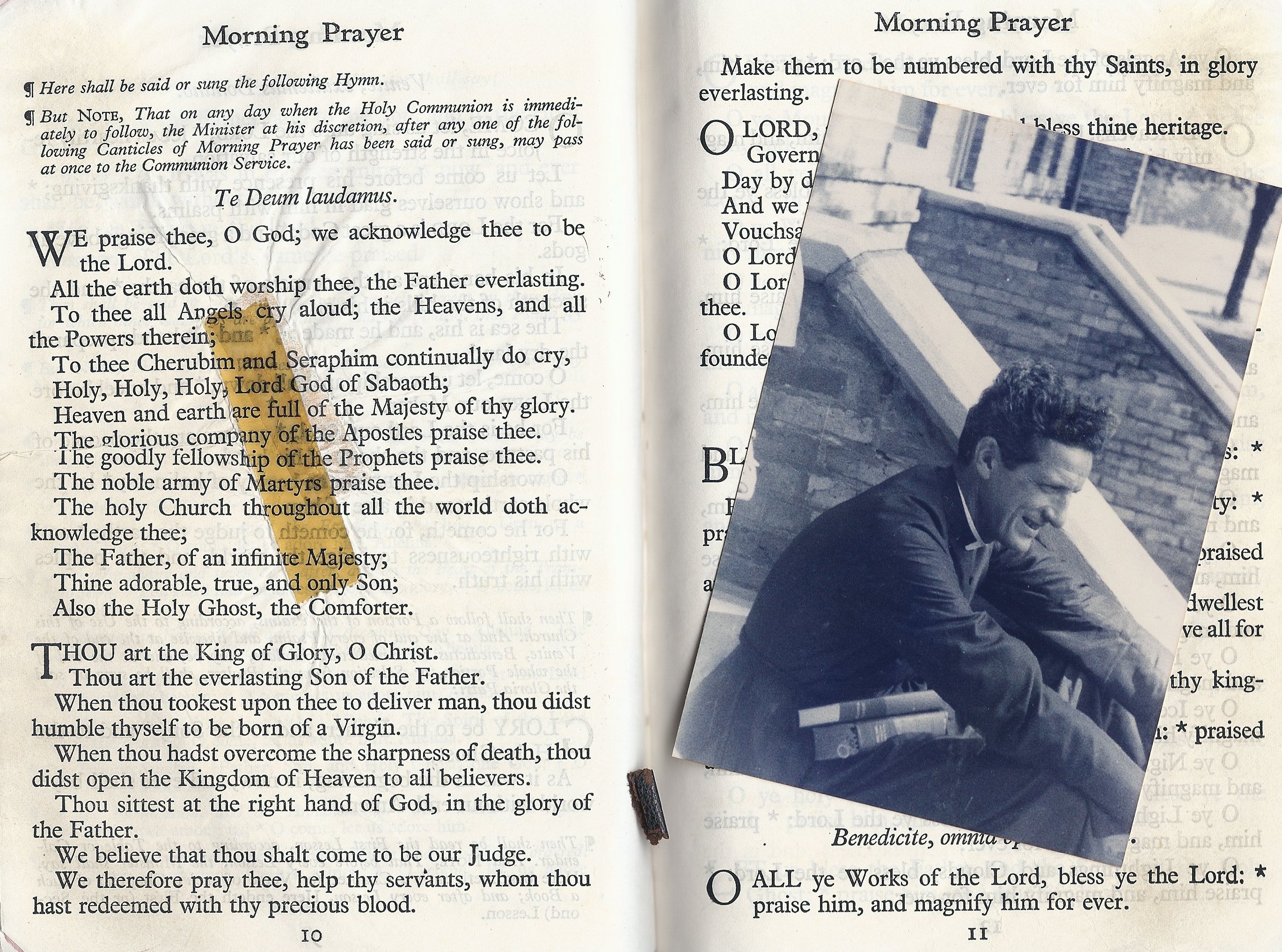 The photo above is of my grandfather, the Rev. J. Rodger McColl, on the steps of the DeKoven Center in Racine, Wisconsin sometime in the 1940s. In the background is a page from Morning Prayer in his BCP/King James Bible combination. The oil stains from his fingers on the pages of the Offices and the Psalms and the yellowing cellophane tape holding the pages together are testimony to a life of daily prayer.